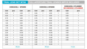 • 68 штук в комплекте, с точными степенями оптической силы и и выполнены из высококачественных материалов, из них 12 штук – минусовые цилиндры